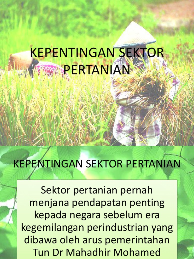 Dewasa ini kepentingan sektor pertanian terhadap pembangunan sesebuah negara tidak dapat dinafikan lagi. KEPENTINGAN SEKTOR PERTANIAN Sektor pertanian pernah menjadi tunjang kekuatan ekonomi negara pada suatu ketika dahulu. Mendukung Kedaulatan Pangan Pertanian merupakan sumber utama pangan dalam suatu negara.